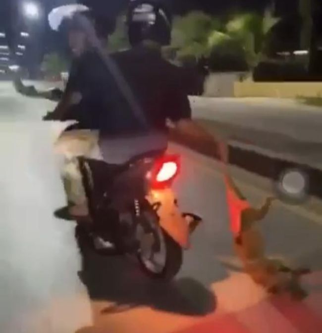 Kedua pemuda menggunakan helm dan motor yang tidak memiliki nomor polisi itu kemudian menyeret anjingnya di jalan raya. Kaki anjing dipegang lalu kepalanya terseret di jalanan.