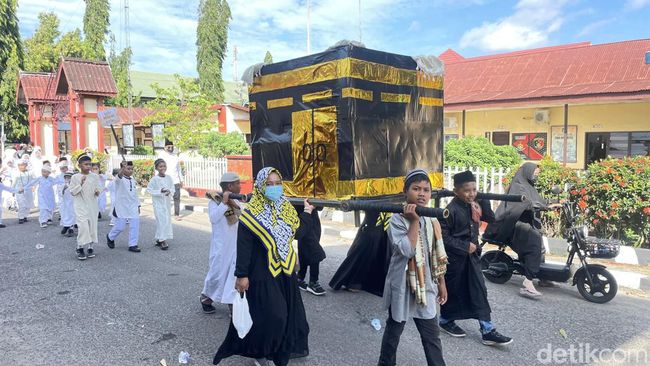Badan Komunikasi Pemuda Remaja Masjid Indonesia (BKPRMI) Pinrang, Sulawesi Selatan (Sulsel) menggelar pawai memperingati 1 Muharram 1445 Hijriyah. Para peserta pawai memakai pakaian unik seperti pakain haji hingga menampilkan atribut ka'bah.