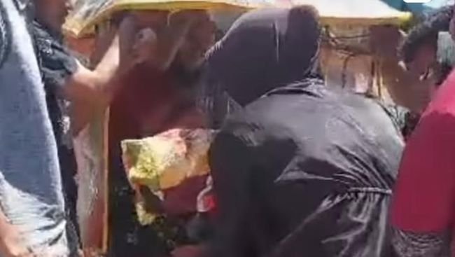 Selanjutnya salah seorang wanita yang mengenakan baju gamis hitam serta beberapa warga lainnya membopong jenazah Vira dari becak motor menuju rumah duka. Jenazah Vira terlihat dibungkus dengan selimut.
