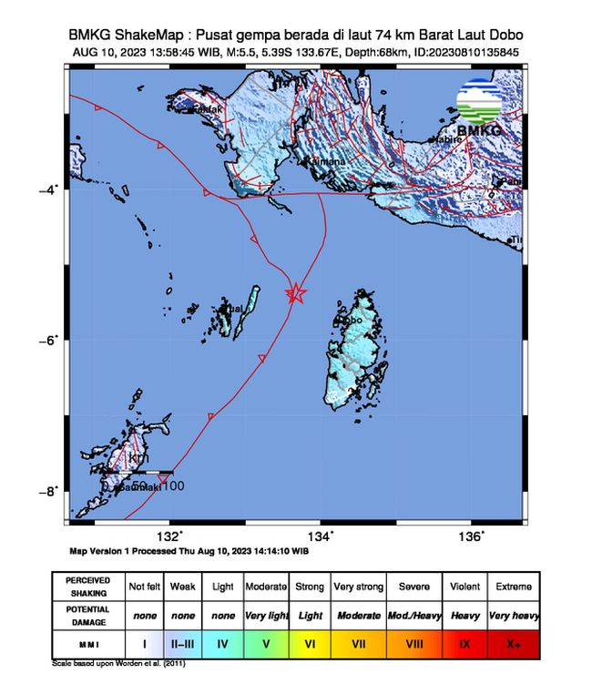 Gempa dirasakan dengan skala II-III di Dobo. MMI II artinya getaran dirasakan oleh beberapa orang, benda-benda ringan yang digantung bergoyang.