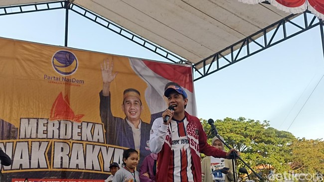 Pantauan detikSulsel di Lapangan Tala, BTP, Minggu (13/8/2023), terdapat spanduk Merdeka Anak Rakyat di atas panggung yang memperlihatkan foto empat orang tokoh NasDem. Mereka adalah Surya Paloh, Anies Baswedan, Rusdi Masse, dan Rudianto Lallo.
