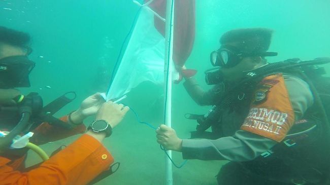 "Pengibaran bendera merah putih ini dilakukan selama 17 menit di bawah laut dengan 8 buah bendera oleh Tim SAR gabungan," kata Komandan Batalyon B Pelopor Satbrimob Polda Sulsel Kompol Ramli kepada wartawan, Rabu (16/8/2023).