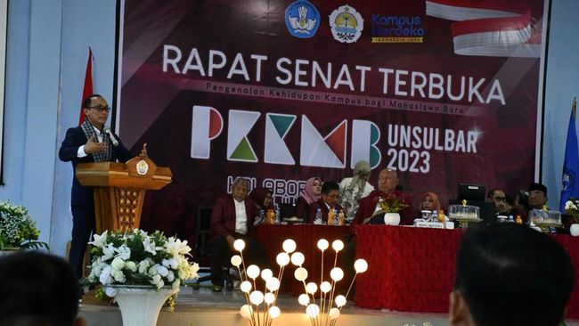 Pj Gubernur Sulawesi Barat (Sulbar) Zudan Arif Fakrulloh menyampaikan orasi ilmiah di hadapan mahasiswa baru (maba) Universitas Sulawesi Barat (Unsulbar). Zudan menceritakan perjuangannya saat kuliah dan mendapatkan beasiswa hingga program doktor atau S3.