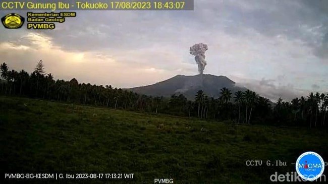 Gunung Ibu di Halmahera Barat, Maluku Utara, mengalami erupsi dengan menyemburkan abu vulkanik setinggi 2.525 meter atau sekitar 2,5 kilometer di atas permukaan laut. Warga diimbau menjauhi radius hingga 2 kilometer.