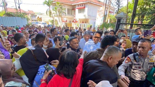 Dalam video yang diterima detikSulsel, Nurdin tiba menggunakan setelan jas berwarna biru abu dengan dalaman berwarna biru muda. Sejumlah warga langsung mengerumuni Nurdin saat hendak menuju mobil.