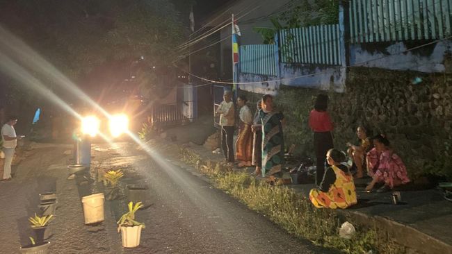 Emak-emak di Parepare, Sulawesi Selatan (Sulsel) memasang pot bunga di tengah jalan. Aksi tersebut dilakukan sebagai bentuk protes terhadap kondisi jalan yang rusak.