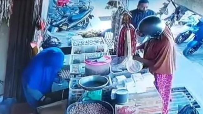 Sementara pedagang sayur yang mengenakan jilbab biru terlihat sibuk meladeni pembeli lain. Seolah memanfaatkan momen, pelaku yang terlihat mengenakan helm hitam dengan masker tersebut kembali mengambil bahan pokok lain berupa kacang. Dia kembali memasukkannya ke dalam kantong belanjaannya.