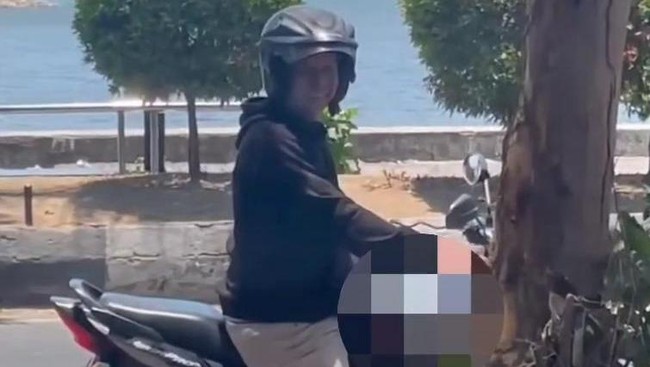Pria tersebut memakai helm berwarna hitam. Selain itu, pria tersebut juga menggunakan jaket hitam dan celana panjang warna abu-abu.