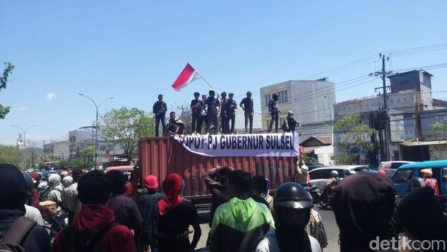 Pantauan detikSulsel di depan Kantor Gubernur Sulsel, Jalan Urip Sumoharjo, Makassar, Senin (16/10), massa aksi tiba sekitar pukul 12.40 Wita. Massa sebelumnya menggelar demonstrasi di depan Kantor DPRD Sulsel.