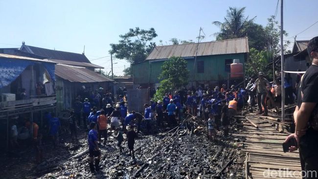 Tampak sejumlah relawan yang terdiri dari pria dan wanita turun ke kolong rumah warga dengan mengenakan sepatu boots. Mereka bahu membahu mengambil sampah yang berada di kolong rumah warga.