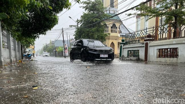 Hujan deras mengguyur Kota Makassar, Sulawesi Selatan (Sulsel) usai dilandai musim kemarau panjang. Jalanan di sejumlah titik pun langsung tergenang usai 30 menit diguyur hujan.