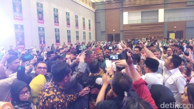 Padatnya peserta Silaknas ingin berfoto membuat Anies kesulitan menuju panggung. Bahkan Master of Ceremony (MC) berulang kali meminta peserta kembali ke tempat duduk masing-masing.