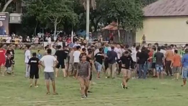 Dalam video viral yang beredar di media sosial (medsos), tampak sejumlah suporter tim yang berlaga memasuki lapangan bentrok. Tampak petugas keamanan ikut memasuki lapangan untuk melerai.