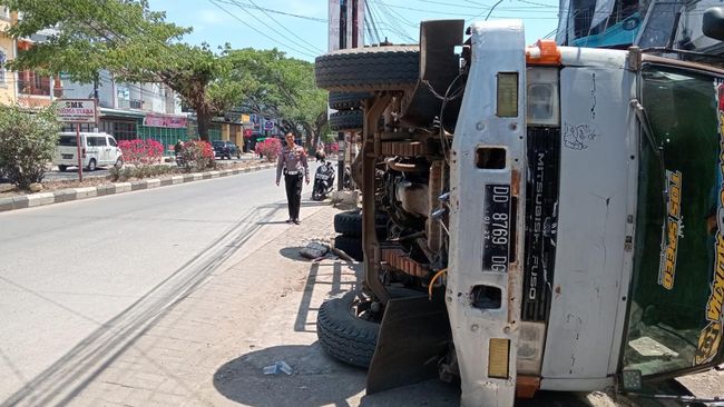 Truk tangki berisi 20 ton air di Kota Makassar, Sulawesi Selatan (Sulsel) mengalami kecelakaan tunggal. Truk tersebut terguling saat hendak parkir gegara got yang dilintasinya ambles.