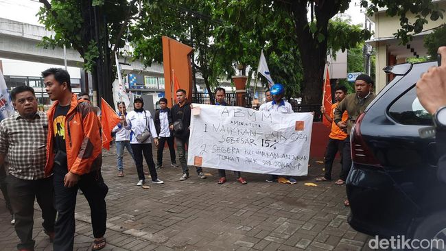 "Menuntut (pertama) naikkan UMK 2024 sebesar 15%, (kedua) segera keluarkan anjuran terkait PHK Sdr. Johan.P," tulisan spanduk tersebut.