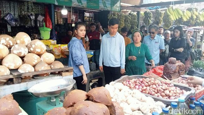Pantauan detikSulsel di lokasi, Gibran tampak berbincang dengan penjual sembako di Pasar Terong, Makassar, Sabtu (25/11/2023). Ditemani istrinya, Selvi Ananda, Gibran menanyakan harga-harga sembako di Pasar Terong.