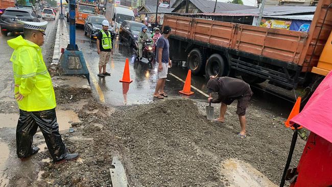 "Kejadian perlambatan keluar jalan tol (perlimaan bandara) akibat adanya pemasangan gorong-gorong yang sudah timbun, namun setelah turun hujan bekas timbunannya bergeser atau hanyut," kata Dirlantas Polda Sulsel Kombes I Made Agus Prasatya kepada detikSulsel, Senin (27/11/2023).