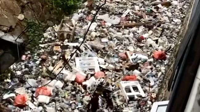 Dalam video beredar, tampak tumpukan sampah memenuhi saluran air tersebut. Drainase itu berada di antara permukiman warga.