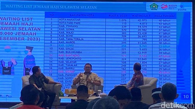 "Kalau kuota yang dilihat di atas ini waiting list yang terlama adalah Kabupaten Bantaeng kurang lebih 47 tahun," ujar Kepala Bidang Penyelenggaraan Haji dan Umrah Kemenag Sulsel Ikbal Ismail di kantor Kemenag Sulsel, Sabtu (2/12/2023).