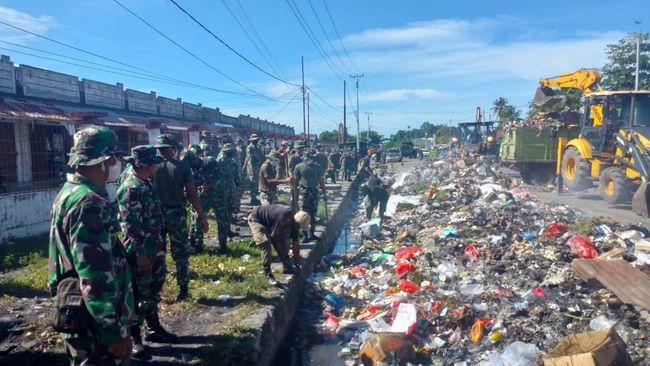 Personel Kodim 1705/Nabire menggelar aksi gotong royong membersihkan sampah yang menumpuk di Pasar Karang Tumaritis, Kabupaten Nabire, Papua Tengah. Aksi bersih-bersih ini dilakukan untuk menjaga kenyamanan masyarakat menjelang perayaan Natal dan Tahun Baru.
