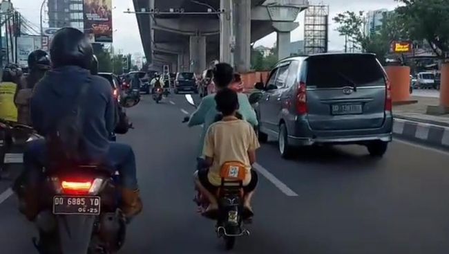 Tiga orang anak di Makassar, Sulawesi Selatan (Sulsel) menuai sorotan usai nekat menerobos jalan raya menggunakan sepeda listrik. Ironisnya, ketiga anak tersebut bonceng tiga dan tidak memakai helm.