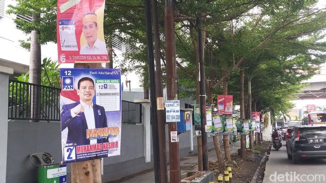 Di tiap pohon yang berjarak kurang dari 5 meter, mejeng sejumlah APK yang terpaku di batang pohon. APK caleg dari berbagai politik ramai terpasang di lokasi tersebut.