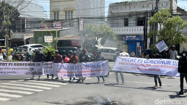 Terlihat dari sejumlah spanduk, massa aksi meminta agar Penjabat (Pj) Gubernur Sulsel Bahtiar Baharuddin dicopot dari jabatannya. Massa aksi juga tampak berupaya menyetop sebuah mobil truk yang hendak melintas namun dihalau oleh petugas kepolisian.