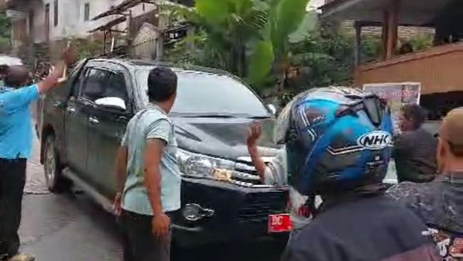 Dalam potongan video pendek yang dilihat detikcom, tampak massa aksi menghalangi kendaraan berpelat merah. Mobil ini ditumpangi Yakub F Solon.