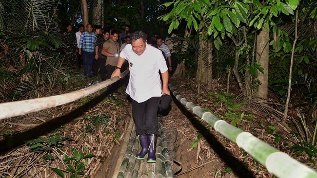 Pj Gubernur Sulawesi Selatan (Sulsel) Bahtiar Baharuddin berkunjung dari desa ke desa untuk memasifkan program budi daya pisang cavendish, termasuk di Kabupaten Bone. Bahtiar didampingi Pj Bupati Bone Andi Islamuddin menyusuri medan terjal demi ke lokasi penanaman bibit pisang.