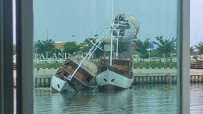 Sementara, dalam foto yang diterima detikSulsel, salah satu kapal pinisi milik Pemkot Makassar yang bersandar di wilayah Pantai Losari oleng ke kiri. Kapal oleng tepat di samping kapal pinisi lainnya.