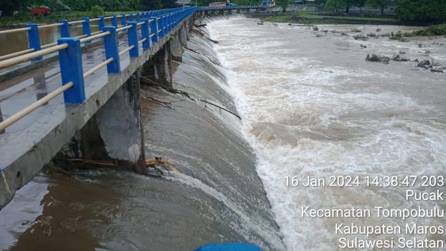 Posko Induk Balai Besar Wilayah Sungai Pompengan Jeneberang (BBWS-PJ) menyampaikan perkembangan terbaru per pukul 14.39 Wita yang diterima detikSulsel, Senin (15/1/2024). Tinggi Muka Air (TMA) Bendung Lekopancing di atas mercu bendung mencapai 60 cm.