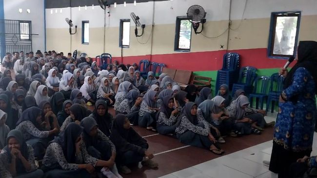 Dari video yang beredar di media sosial, tampak sejumlah siswa terlihat berkumpul dan berkerumun di koridor sekolah. Mereka tampak menyimak penjelasan dari seorang guru berbaju putih.