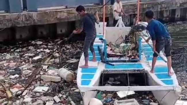 Viral di media sosial video yang memperlihatkan kondisi laut Anjungan Pantai Losari, Makassar, Sulawesi Selatan (Sulsel) yang dipenuhi banyak sampah. Dinas Perikanan dan Pertanian (DP2) Makassar langsung turun tangan membersihkan sampah menumpuk tersebut.