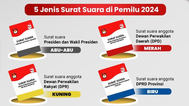 Warna penanda surat suara pemilu ini terdiri dari 5 jenis. Warna surat suara Pemilu 2024 ini ditentukan berdasarkan jenis pemilihan untuk pilpres, pileg DPR RI, DPD RI, dan DPRD provinsi, serta DPRD kabupaten/kota.