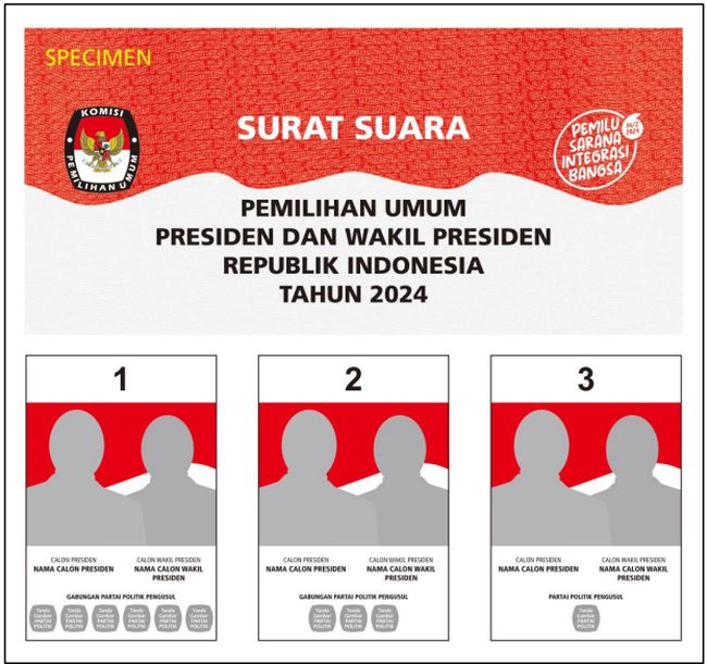 Pemilihan presiden dan wakil presiden dalam Pemilu 2024 ini ini melibatkan tiga pasangan calon, yakni Anis Baswedan-Muhaimin Iskandar (Paslon 1), Prabowo Subianto-Gibran Rakabuming Raka (Paslon 2), dan Ganjar Pranowo-Mahfud MD (Paslon 3).