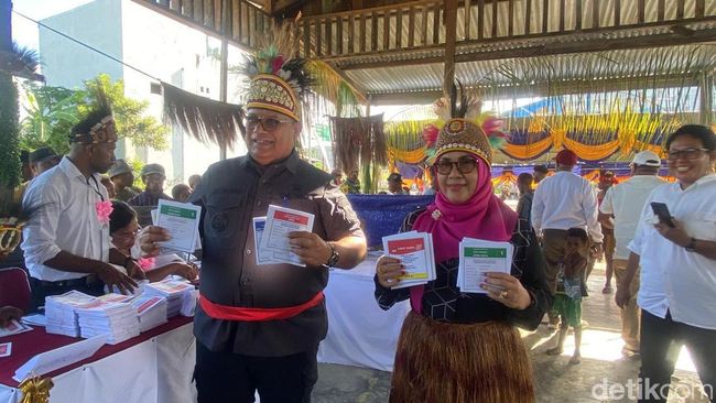Pantauan detikcom di lokasi, Rabu (14/2/2024) sekitar pukul 08.20 WIT, Mochmad Musa'ad dan istrinya mendatangi TPS nomor 32, Kampung Nelayan, Rufei Pantai, Kota Sorong. Musa'ad disambut tarian Papua lalu pengalungan kain merah dan pemakaian mahkota Papua.