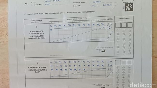 Pantauan detikSulsel di TPS 011, Rabu (14/2/2024) sore, Prabowo-Subianto meraih 132 suara, Anies-Muhaimin mengantongi 48 suara. Sementara pasangan capres-cawapres nomor urut 3 Ganjar Pranowo-Mahfud Md hanya memperoleh 15 suara.