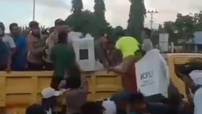 Dalam video beredar, tampak warga mengerumuni sebuah mobil truk kuning yang mengangkut ratusan kotak suara. Mereka menaiki bak truk dan mengambil paksa kotak suara lalu menurunkannya.