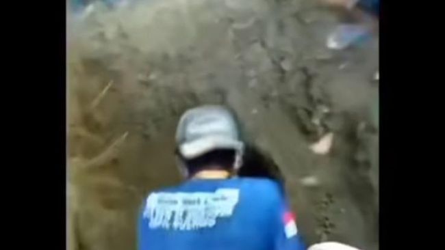Dalam video beredar dilihat detikcom, Selasa (20/2/2024), tampak warga berkumpul di sebuah makam. Seorang pria yang mengenakan topi dan kaos biru menggali makam menggunakan sekop.