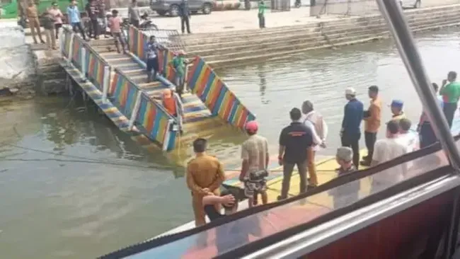 Rombongan Pj Wali Kota Kendari, Sulawesi Tenggara (Sultra) Muh Yusuf tercebur ke laut saat melewati jembatan darurat menuju kapal. Insiden itu terjadi saat rombongan hendak memantau kegiatan Hari Peduli Sampah Nasional (HPSN) di laut.