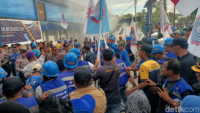 Demo buruh di depan Kantor Bea Cukai Samarinda, Kalimantan Timur (Kaltim) berakhir ricuh. Massa aksi merusak pagar dan menerobos masuk ke Kantor Bea Cukai Samarinda.