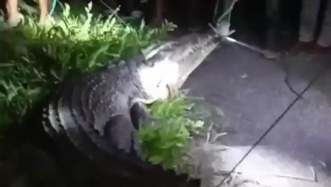 Warga lalu mengikat mulut dan badan buaya menggunakan tali nilon. Penangkapan buaya itu menarik perhatian perhatian masyarakat setempat.