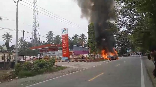 Peristiwa tersebut terjadi di depan SPBU Bone-bone, Kecamatan Bone-bone, Luwu Utara, sekitar pukul 13.00 Wita, siang tadi. Mobil jenis minibus tersebut terbakar setelah mengisi BBM di SPBU.