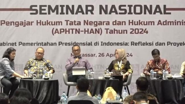 Asosiasi Pengajar Hukum Tata Negara dan Hukum Administrasi Negara (APHTN-HAN) menggelar rapat kerja nasional (Rakernas) di Makassar, Sulawesi Selatan (Sulsel). Salah satu agendanya ialah seminar nasional yang membahas soal penataan kabinet presidensial di Indonesia.