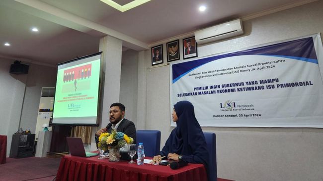 "Mayoritas pemilih sebesar 65,6% menginginkan gubernur yang mampu menyelesaikan masalah ekonomi tanpa mempertimbangkan asal-usul etnis calon Gubernur," kata peneliti senior LSI Denny JA, Ikrama Masloman di Hotel Horison Kendari, Selasa (30/4/2024).