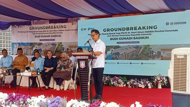 Menteri Kesehatan RI Budi Gunadi Sadikin menghadiri groundbreaking atau peletakan batu pertama pembangunan gedung rawat inap Rumah Sakit Umum Daerah (RSUD) dr Hasri Ainun Habibie Gorontalo. Proyek yang dibangun dengan lima lantai itu menelan anggaran senilai Rp 25,9 miliar.