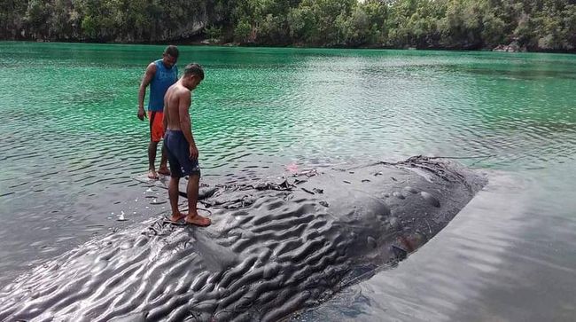 Bangkai paus dengan panjang 16 meter yang ditemukan di perairan Raja Ampat, Papua Barat Daya dibiarkan membusuk di pinggir pantai. Bangkai paus tersebut tidak dikubur karena tidak ada lokasi yang memadai di sekitar lokasi.