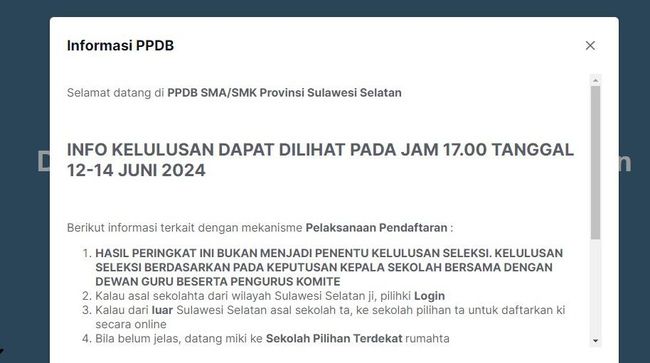 Pengumuman PPDB Sulsel 2024 untuk jalur zonasi, afirmasi, dan perpindahan tugas orang tua/wali dapat dilihat di portal resmi PPDB Sulsel. Berikut link dan cara cek pengumuman PPDB Sulsel 2024 jenjang SMA: