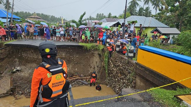 Seorang pengemudi motor bernama Maskun Mantu (38) terjatuh di Jalan Trans Sulawesi di Kabupaten Bone Bolango, Gorontalo yang putus diterjang banjir pagi tadi. Korban dilaporkan hilang usai terseret arus sungai.