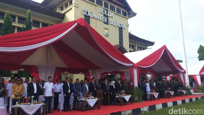 Pantauan detikSulsel di lokasi, Senin (1/7/2024) upacara dipimpin oleh Kapolda Sulsel Irjen Andi Rian R Djajadi. Tema HUT Bhayangkara tahun ini adalah 'Polri Presisi Mendukung Percepatan Transformasi Ekonomi yang Inklusif dan Berkelanjutan Menuju Indonesia Emas.
